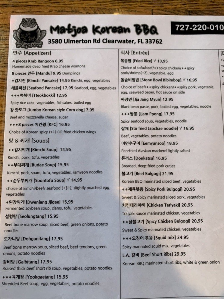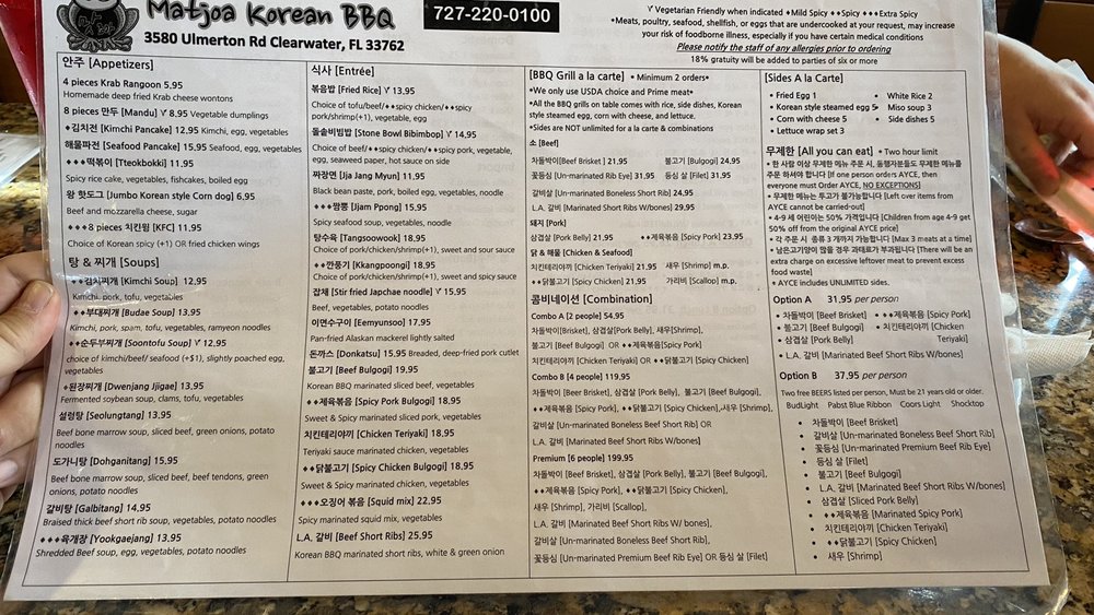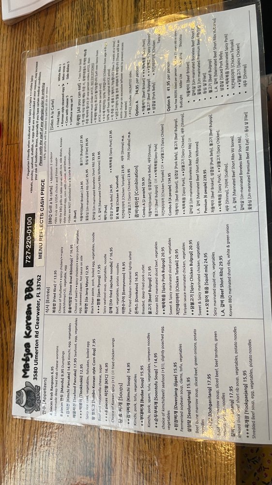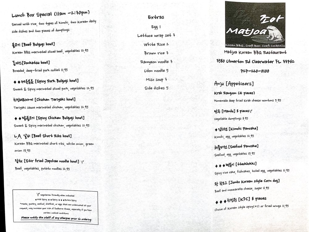 Matjoa Korean BBQ is a trendy and casual restaurant that offers a wide variety of delicious Korean barbeque dishes. Located in Clearwater, FL, this establishment is perfect for dinner with friends or family. The menu features mouthwatering appetizers like Jumbo Korean Style Corn Dog and Kimchi Pancake, as well as enticing entrees such as Stone Bowl Bibimbop and Stir Fried Japchae Noodle. The soups, including Kimchi Soup and Dwenjang Jjigae, are also flavorful and satisfying. With options for both meat lovers and vegetarians, Matjoa Korean BBQ caters to a diverse range of palates. The restaurant also offers delivery, takeout, and catering services, making it a convenient choice for any occasion. Don't miss out on the Happy Hour specials and full bar options when you visit Matjoa Korean BBQ.
